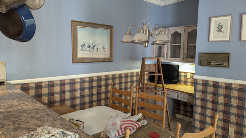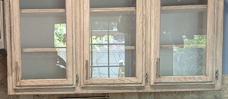 The process takes a while, but the results seemed well worth the effort. You can see at right (not to spoil the eventual result) what the Honey Oak looks like after the refinishing. This was not anything I could do, so I called the carpenter that had done the work in the study and also outside. He and his daughter, who helps him with estimating, came over and I showed them the video and asked if this were a project he could or would want to do. They did some investigating to make sure they could obtain the necessary products, and they worked to understand all the steps and give an estimate for the entire kitchen and the small desk area on the other side of the breakfast area.