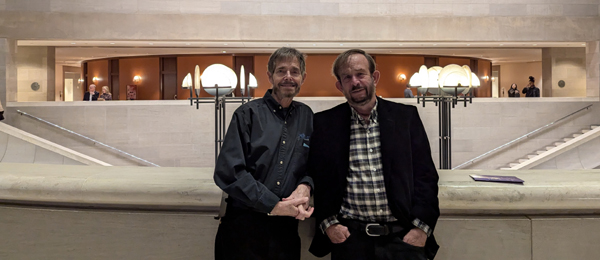 At intermission this evening, I had a fellow concertgoer take a couple of pictures of Fred and me spending our intermission people-watching on the bridge.