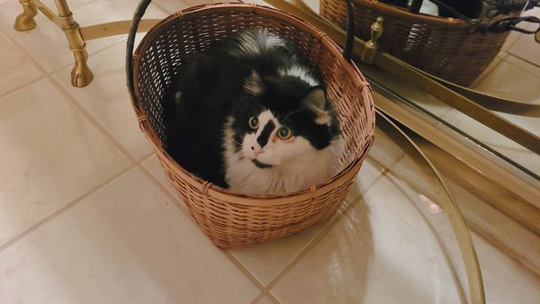 Lucky has a few spots around the house where he prefers to curl up, but this was a new one on me: