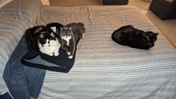 You've seen numerous pictures of the cats on my clothes, but this picture reminded me of "musical chairs" just after the music ends and someone (Cole) is left without a seat (a spot on some clothes):