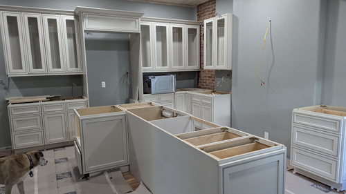 In the picture at left, we are looking from the main kitchen down a short hall to the powder room, which is at the left right by the window you see here. You can see the new powder room in the picture at right. The finishes Prudence has chosen are all very nice. Below is a picture of the way the main kitchen looks at the moment. Most of the cabinets are in place, and the rest of the appliances and range and range hood are awaiting installation.
