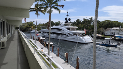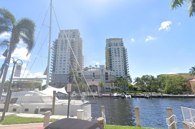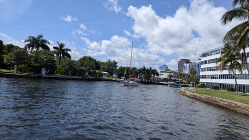 Once you get past the Icon Las Olas, the Riverwalk is back on land, and you come to North New River Drive. This street comes south from Las Olas on the west side of the Icon Las Olas. It continues to follow the bank of the New River, and it gives access to the various highrises that have been built on the north side of the river. The actual Riverwalk itself winds through a narrow landscaped area between this street and the actual river.