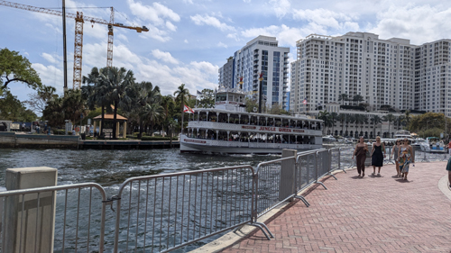 As you come down into Old Fort Lauderdale, there is a lot of greenspace along the river, and you can get right up to the riverbank for good views. As we were doing that, the bridge that carries the FECR/Brightline over the river came down, indicating that either a Brightline train or a freight train would be coming across the river.