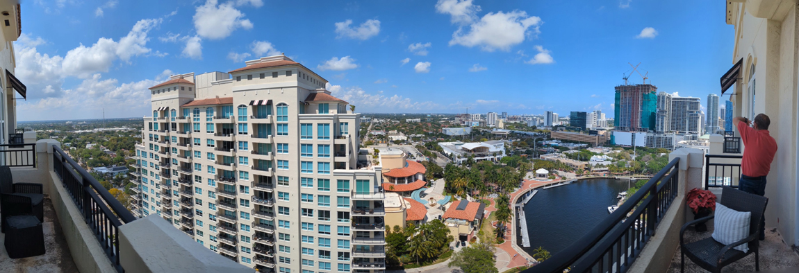 The other thing we did towards the end of our visit was to take some pictures from Bruce's balcony. Being on the north side of his building, he has excellent views to the west and north, of course. He can even see to the east. Sailboat Bend, the Performing Arts Center, the Science Museum, and the Esplanade are right below, and he is high enough that the north tower doesn't block too much. To begin, here is a panoramic view: