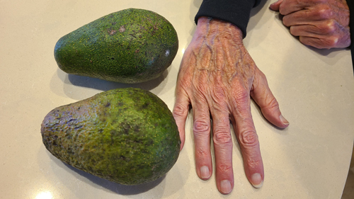 More useful are the avocados, as we have guacamole almost every day. And these aren't small avocados, like the ones you are probably used to. As you can see in the picture below, these fruit are huge: