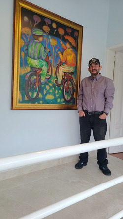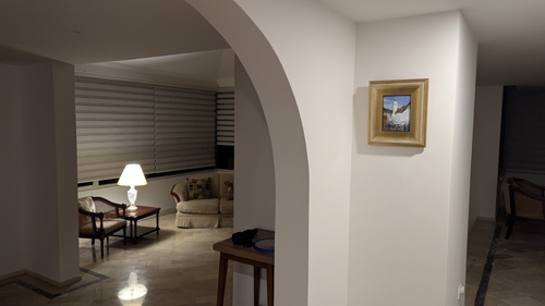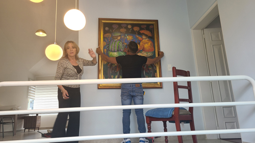 When Paty arrived, we helped get the two paintings upstairs, where we were going hang one of them on the wall between the common area and the bedroom that Greg was to have used. The two pictures above were taken during the process of hanging that picture. The other work was hung on the wall in the common area just to the left of the door to our bedroom. Both are in highly visible places.