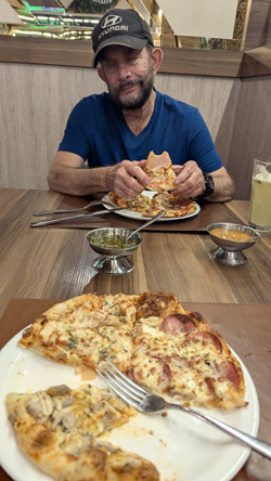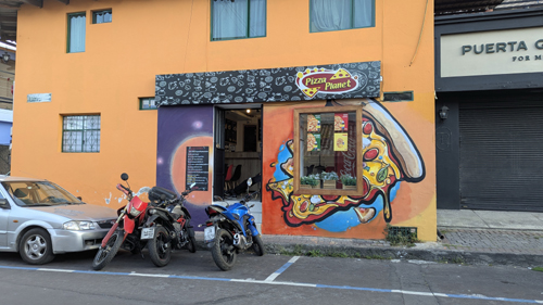 We had seen it numerous times, as it is across from the bakery that Fred favors- the King Bakery (Rey Pan). We had a pizza, which was quite good, although the ingredients and toppings were very Ecuadorian. I took the picture at left, and we had the waiter take the one below.