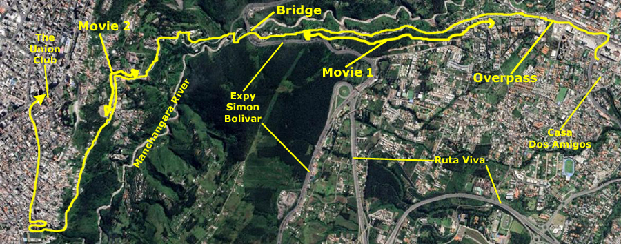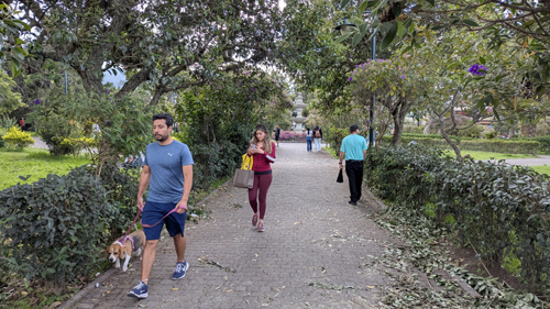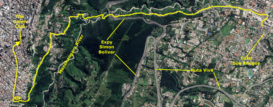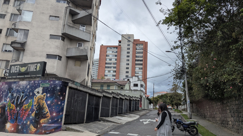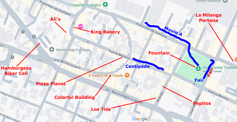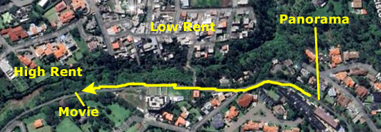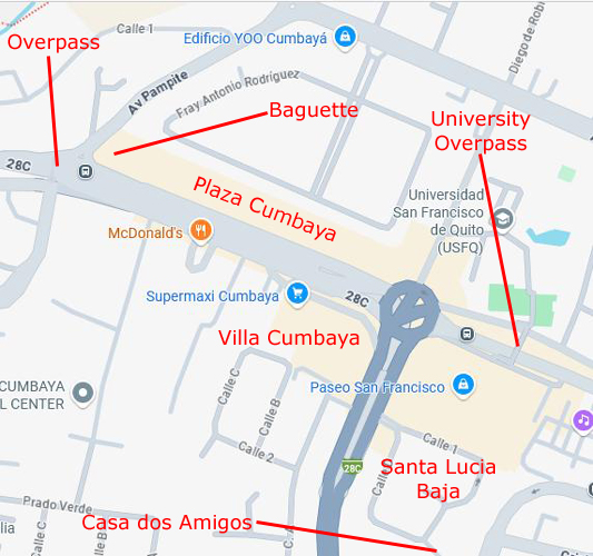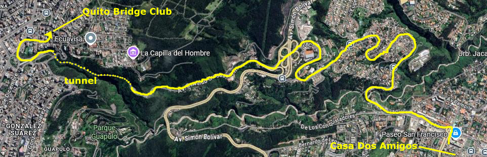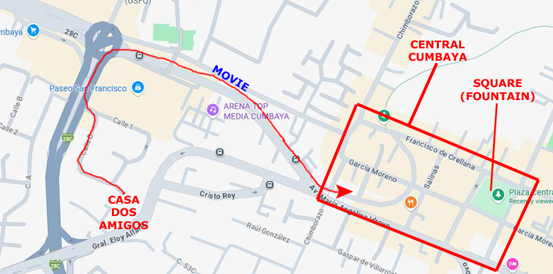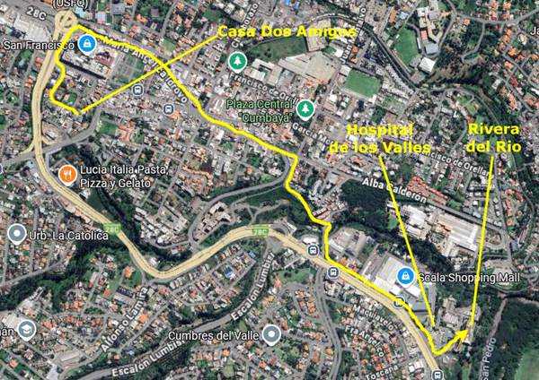 On the aerial view at left, you can see the route we usually follow to get there, circling around Paseo San Francisco, heading down Maria Idrova, and then heading south on the private street that ends in the walkway/stairs down the hillside, past the public swimming pool, and then up to Oswaldo Guayasamin, the main street that runs by Scala Mall.