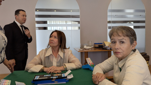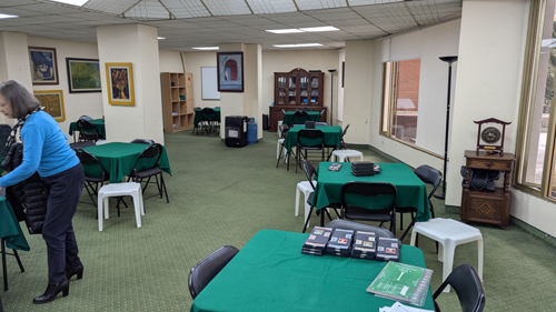 The Tumbaco Valley Bridge Club has arranged to have its games in what appears to be a kind of recreation space on the second floor, just up one flight of stairs.