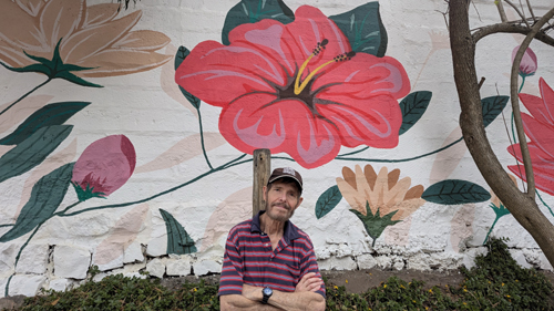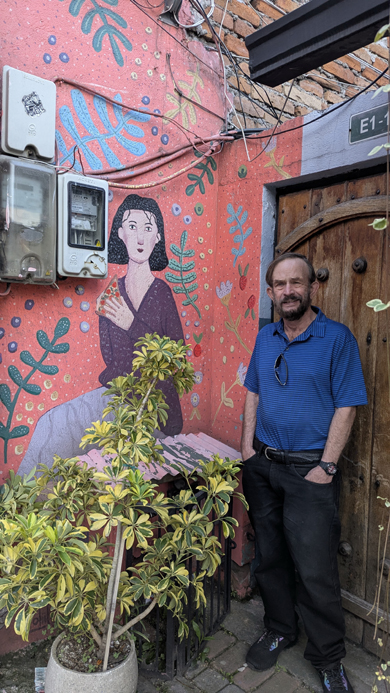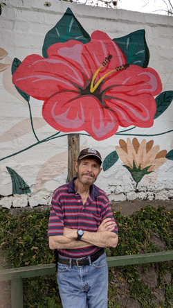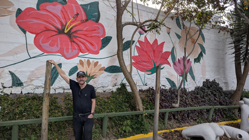 Here at the official entry, though, there are some benches to sit on as well as a pretty nice mural off to the left of the entry gate. At left and below are some pictures that we took on one of our walks to the top of the trail in which we used this mural as a backdrop.