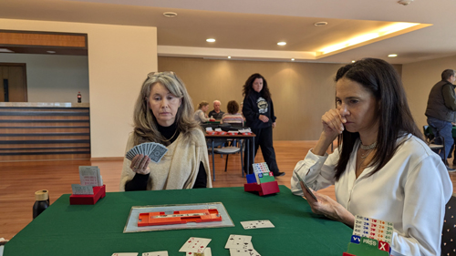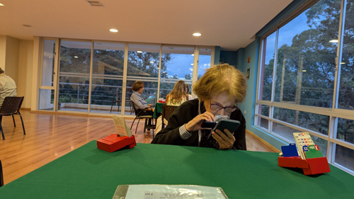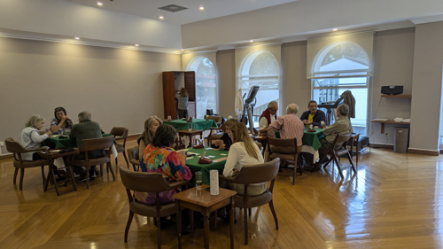 The Club stores all its equipment in that kitchen area, and the first people to show up can help with moving the card tables around, putting green tablecloths on them, getting out the plastic "boards" that contain the four hands of cards, opening up the bidding boxes that are used in lieu of verbal bidding, and shuffling the cards to create new hands from the last time the boards were used. I learned that someone also usually brings something like cookies or some sort of light snack, and these are set out on the counter between the kitchen area and the open space. People often stop at the snack bar of the hospital (which is just across the driveway from the main entrance to Rivera del Rio) to get drinks if they want them.