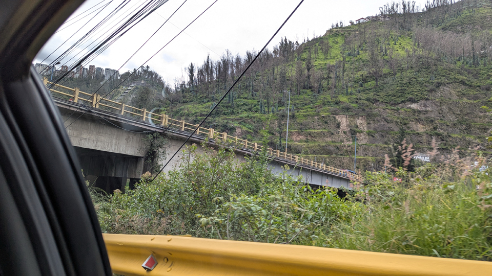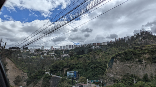 As we drove, there were interesting views out both sides of the vehicle (taxi in this case) and I was sliding back and forth across the back seat to have a look. To the right, you can see the residential highrises in Quito that have been built right on the crest of the mountain ridge that forms the eastern border of the city. I can only imagine that the views from these residences are spectacular; on this side of the building, there would be wonderful views of the Tumbaco Valley and Cotopaxi volcano, while on the other side there would be tremendous city views, as the land slopes down on the other side of the ridge.