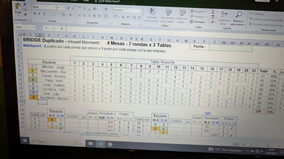 The first time I played with Gustavo, we were second; my first outing with Maria Lourdes had us tied for third, while on the second we were also third, but not in a tie. At my first game with Maria, I had gotten a ride with Marcelo, and since he does the scoring on his laptop, I stayed with him until that was done. Just for my own edification, I took a picture of his computer screen when the scoring was done.