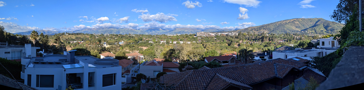 When we are ready to head home, we can leave the mall from the back where there is an access to the Chaquinan nature trail (as you can see on the map at the top of this section. Although returning on the trail is longer, the grade is much less steep than on the stairs, and the views are better. A ways up the trail, there is a spot where the wall that keeps folks from getting down in the canyon that parallels the trail to the north and east gets fairly low, and if you walk over to it there are great views out and across the Tumbaco Valley. Here is a panoramic view of what you can see from here: