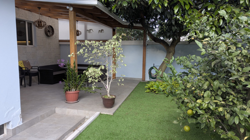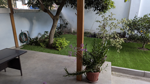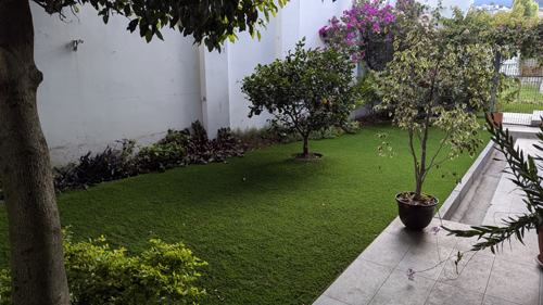The result has been a kind of ratty looking lawn, particularly anywhere around the tree. A year or so ago, having gotten tired of trying to keep this area looking good, we decided to have artificial turf put down from the front gate all the way to the back wall (leaving the flower beds along the back wall and the wall separating our yard from Mrs. Chiriboga's small house intact). We were very pleased with the result.