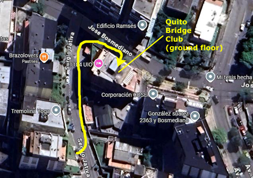 In an unusual move, the Quito Bridge Club actually bought the ground floor space so they could remodel it to better suit its function as a card room. From wherever we park on the side street, we just walk ahead to the corner, hang a right, walk a few feet and find ourselves at the entrance to the bridge club.