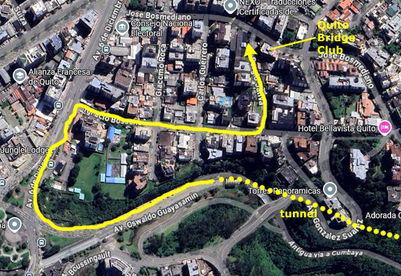 But the route to the Union Club takes a different path, shown on the little map in blue. This road angles off from Oswaldo Guayasamin just at the top of our neighborhood section of that street where the pedestrian overpass is.