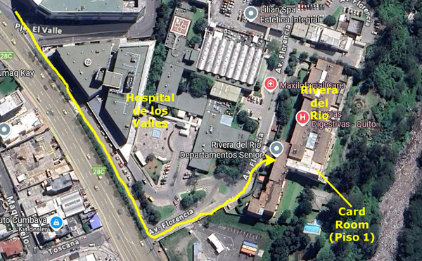 Walking up to Avenue Oswaldo Guayasamin and turning left, it is just a few blocks along the street until you can see Scala Mall ahead on the left. As I may have said above, Scala Mall is right beside Hospital de la Valle (Valley Hospital), and just beyond that is the Rivera del Rio, the retirement home where the Wednesday bridge game is held.
