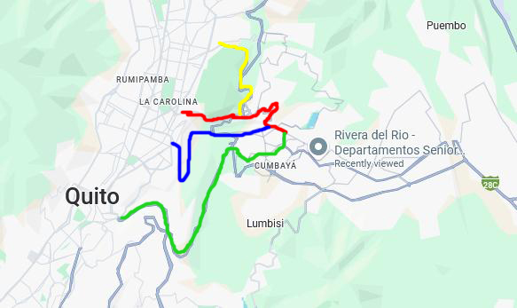 If you are going to the northern part of the city say, at the northern end of Parque Carolina, you can start off on the red route following Oswaldo Guayasamin but then turn north onto the Simon Bolivar Expressway. This road actually continues to the Equator Park and the northern part of Ecuador, but there is a road that branches off to go into the northern part of Quito. We have taken this route to get to the government building that issues cedulas.