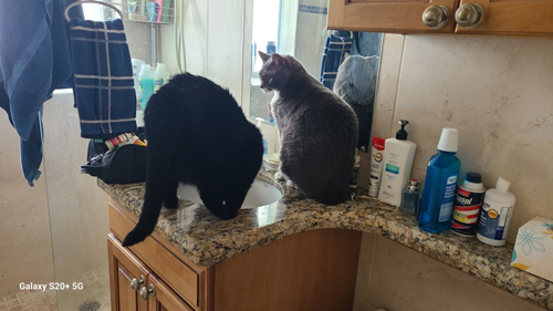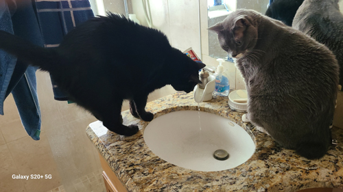 Bob and Cole are old hands at traveling to Florida; I would guess that this is their tenth time here together. They are such a fixture of our visits here that we've taken fewer and fewer pictures of them. Fred took all the pictures of them this time, including this picture of Cole getting combed in my lap, and these two pictures of the pair of them getting a drink at the bathroom sink: