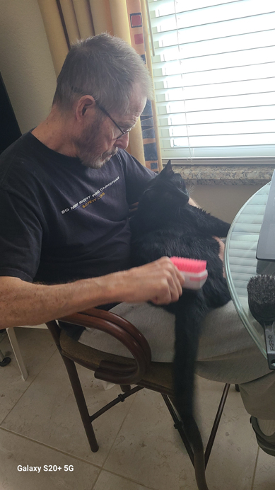 I must say that both cats seem to be good travelers. It's true that usually, maybe a few hours into the first day's driving, Bob tends to spit up, he only does it once, and only on the first day. We're prepared for it, and ready to do a "clean-up on aisle 6". Most of the time, both cats can be found sitting or sleeping in their carriers, although both of them will come out every so often, come up front to see what's going on, maybe stay for a little while, and then go right back to their cozy spaces. They hardly eat or drink at all in the car, usually waiting until we get to our motel. There, the cats get to eat and run around the room.