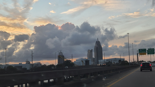 The only pictures from the trip home were taken by Fred (as I was driving) as we crossed Mobile Bay. Just before we reached the Bay it began to sprinkle, which marred Fred's picture of the sunset over Mobile Bay, even though I'd run the windshield wipers just before he took his picture.