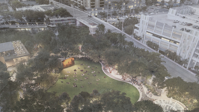This year, Huizenga Park is being entirely redeveloped. There have been barricades along the Riverwalk to block off the park itself, and it has appeared that it is being relandscaped, with new palms and other stuff. On our walk today, we discovered a sign that showed what the park is going to look like when it redone. That picture is at right. It seems that there will still be a lawn, and that the fountain will still be there, but apparently there will be some kind of projection facility and maybe some other changes.