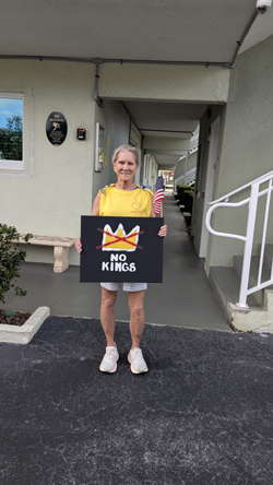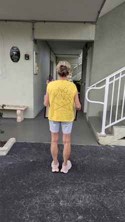 That said, the two pictures at left are of Sue, one of the residents just below Fred and I and whom, along with her husband Marv, Fred and I know pretty well, dressed to attend a "No Kings" rally that is going on today about a mile up Federal Highway from here. Participants at these protests often carry homemade signs or wear handmade clothing like Sue's. While what the protesters are protesting is in fact deadly serious, these are not the dangerous, serious protests of, say, the Civil Rights era. The tenor at these protests, pretty much no matter where they are being held, is almost lighthearted.
