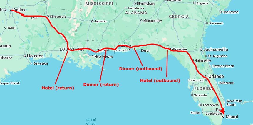 We made the right choice as the traffic was pretty smooth up and across the Mississippi River bridge and on to the place where I-12 heads directly east, bypassing the dip I-10 makes down throught New Orleans. From where we get onto I-12, it is 90 minutes or so to Mississippi and then an hour or so across that state. Mississippi turns into Alabama, and it is another hour across Alabama, with the most interesting feature being passing under Mobile Bay in the bridge/tunnel. About 40 miles past Mobile we enter Florida, where we either stop for supper at Pensacola or another twenty miles along at Niceville (which we did this time) at about 7-7:30pm. After dinner, we have now developed the habit of continuing on to Tallahassee, ariving there about midnight.